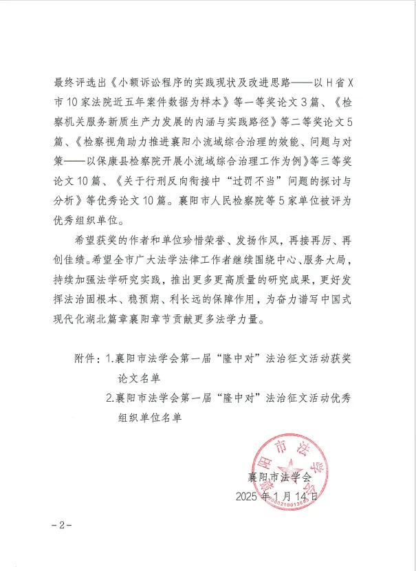 近日,南漳法院在2024年度襄阳市法学会第一届“隆中对”法治征文活动中共计斩获2个奖项。